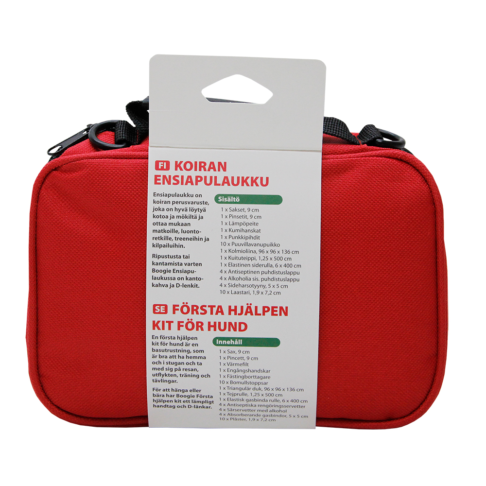 Koiran ensiapulaukku on koiran perusvaruste, joka on hyvä löytyä kotoa, autosta ja mökiltä. Ja koska vahinko ei tule kello kaulassa, ensiapulaukku kannattaa pakata mukaan myös matkoille, luontoretkille, treeneihin ja kilpailuihin. Ripustamista ja kantamista varten Boogie Ensiapulaukussa on kantokahva ja D-lenkit.