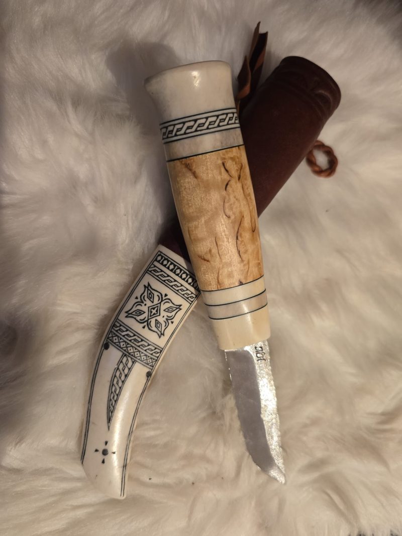 Kahva: luu/visakoivu. Tuppi: nahka/luu.
