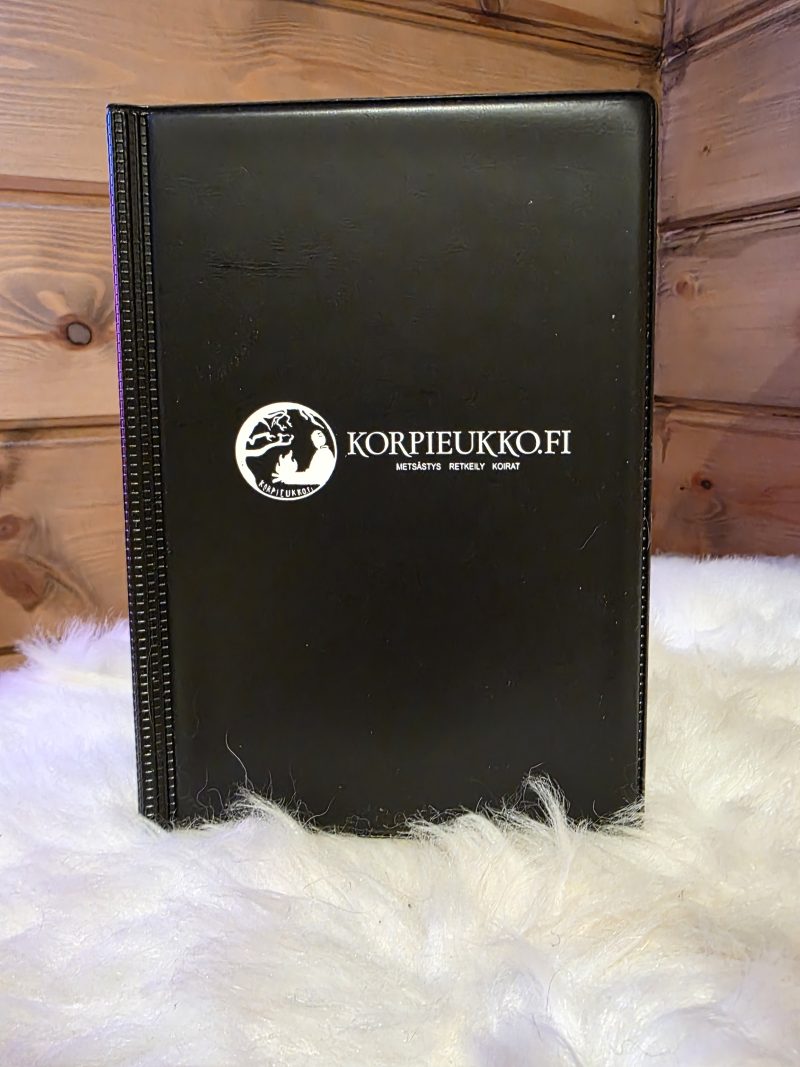 Muovipäälysteinen maastokorinsuoja, koko avattuna L240 x K170 mm, kannessa paikka kynälle.